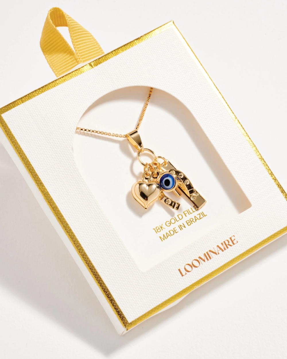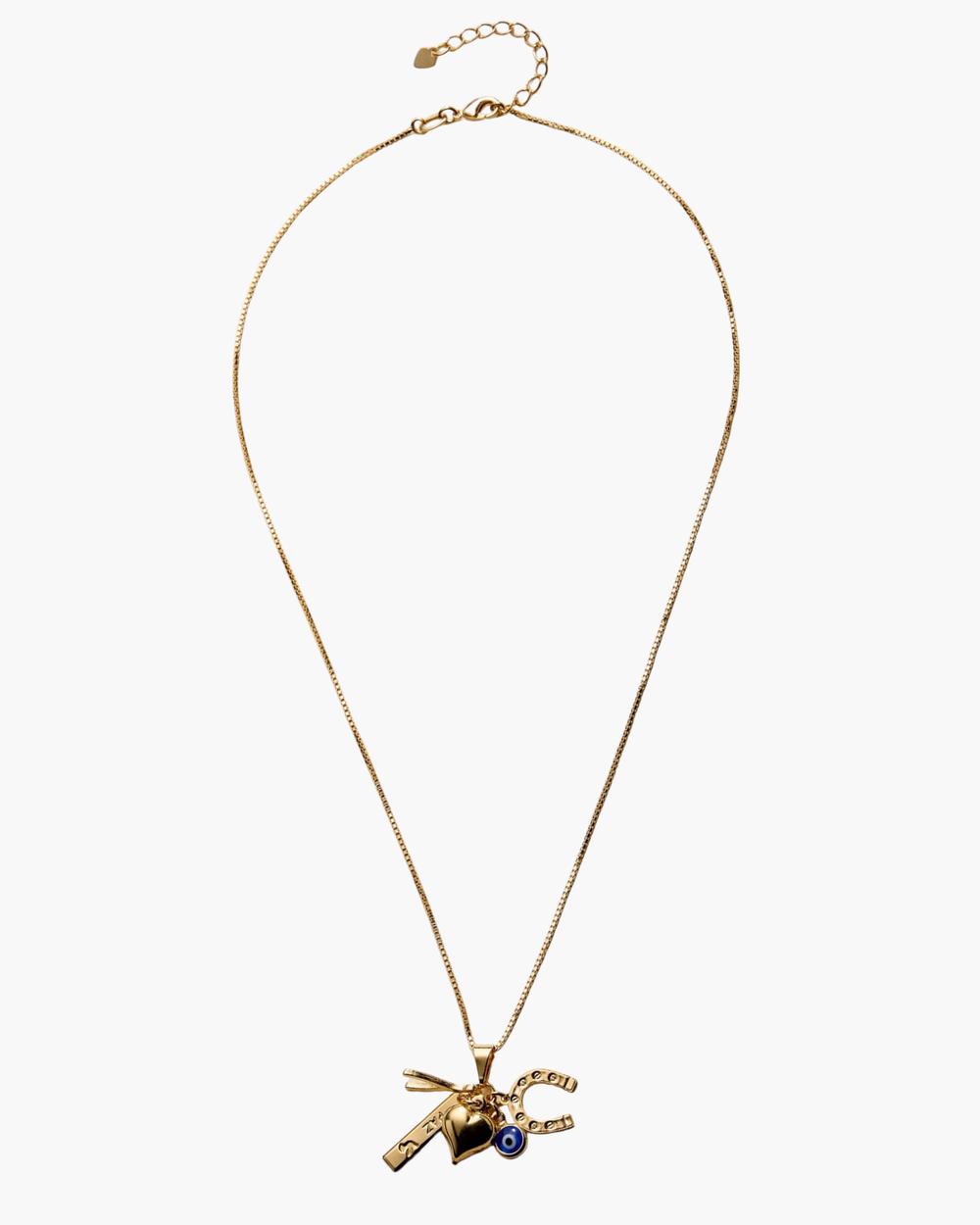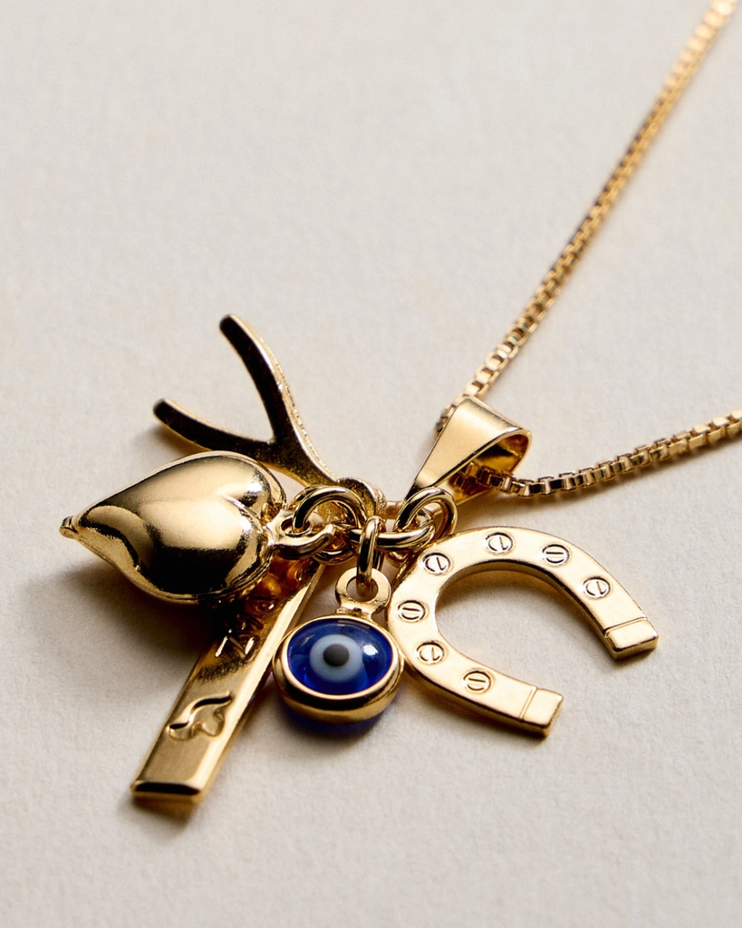 Stack up the good vibes with this playful gold-filled charm necklace! Adorned with a Heart, Horseshoe, Evil Eye, and Wishbone, each pendant brings its own dose of luck, love, and protection. Perfect for layering or wearing solo, this charming piece keeps your favorite symbols close and your spirit lifted.
