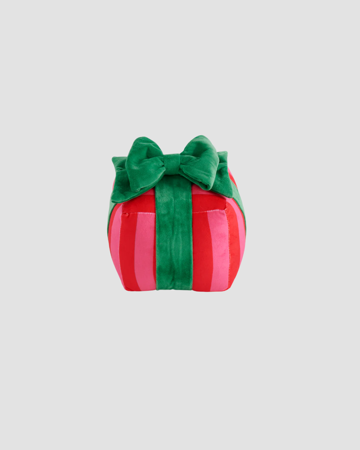 The Stripe Gift Box Small Pillow is a holiday treat you'll want to unwrap right away, featuring vibrant red, green, and blue stripes with a plush velvet bow on top. Its soft, snuggly design adds a cheerful splash of festive fun to your couch, bed, or even under the tree.