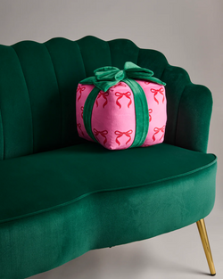 Bring playful holiday spirit to your home with the Bow Gift Box Medium Pillow, featuring a pink plush base covered in red bows and topped with a big green velvet ribbon and bow. Its cube shape makes it a fun accent for couches, beds, or even a cozy gift-like touch under the tree.
