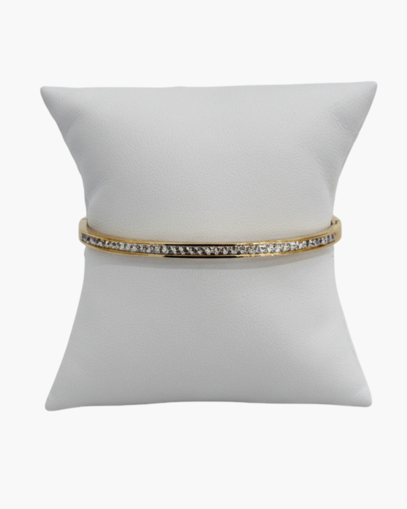 A timeless gold bangle bracelet featuring a luminous row of cubic zirconia stones. This sophisticated piece combines understated elegance with radiant sparkle, making it an essential accessory for refined style and versatile wear.