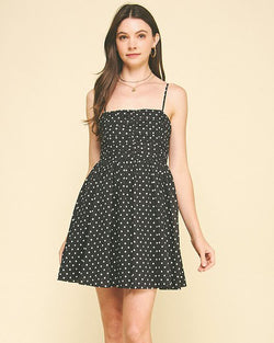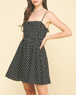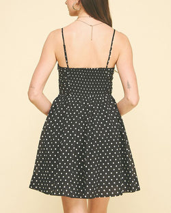 This darling mini dress features a chic polka dot pattern, smocking at the back, a sleeveless silhouette and pleated detail. Easy to dress up or down, this dress is on trend and so much fun!