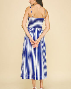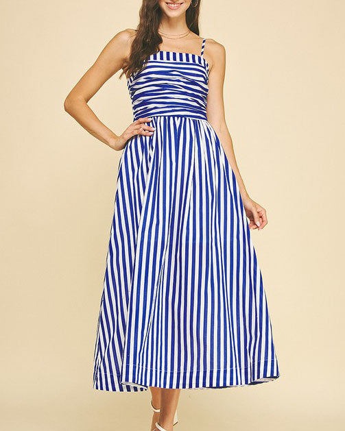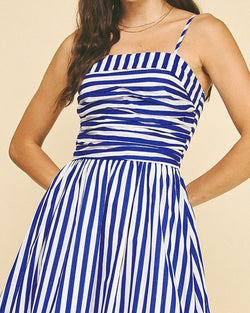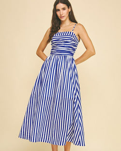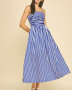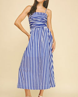 This adorable midi dress features a chic stripe pattern, smocking at the back, tucked detail at the bust and adjustable straps. Done in classic blue and white, this dress is versatile and timeless.