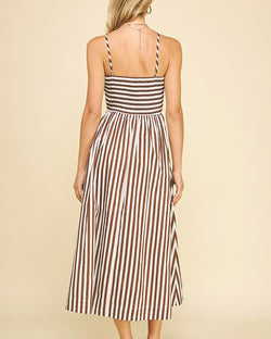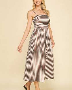 This adorable midi dress features a chic stripe pattern, smocking at the back, tucked detail at the bust and adjustable straps. Done in a chic brown and white color combination, this dress is versatile and timeless.
