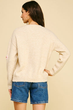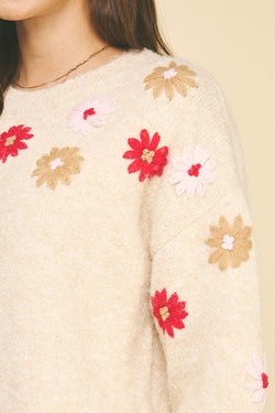 This oatmeal-colored sweater features delicate floral embroidery that adds refined charm to its cozy, soft fabric. Designed for fall, it offers a comfortable fit with a classic round neckline and long sleeves, making it an elegant choice for cooler days.