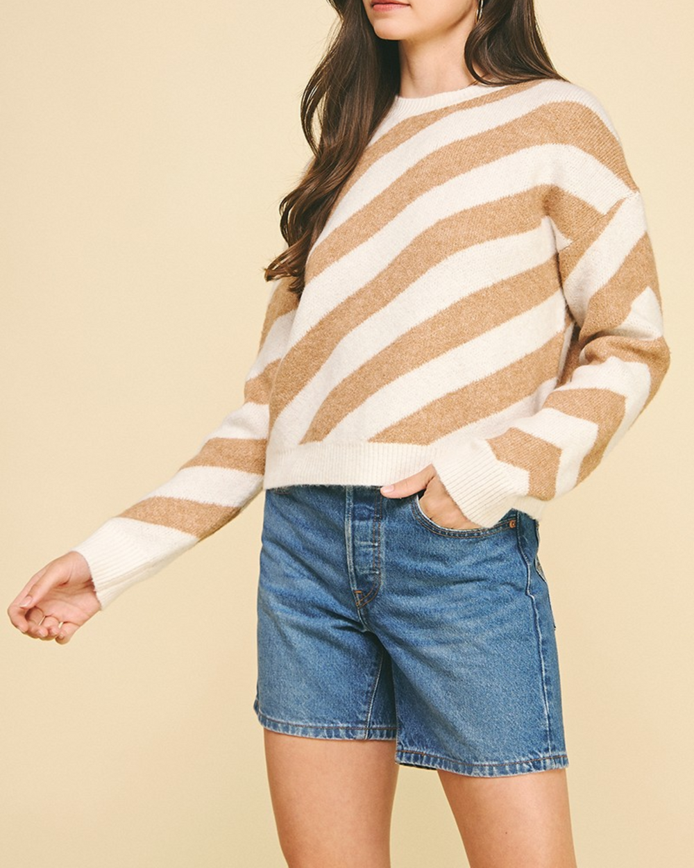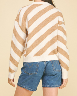Make a fun twist on classic style with this navy and taupe diagonal stripe sweater. It’s your new go-to for adding a splash of playful pattern.