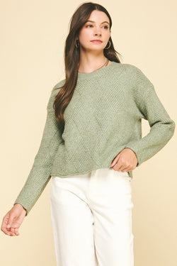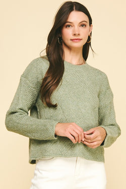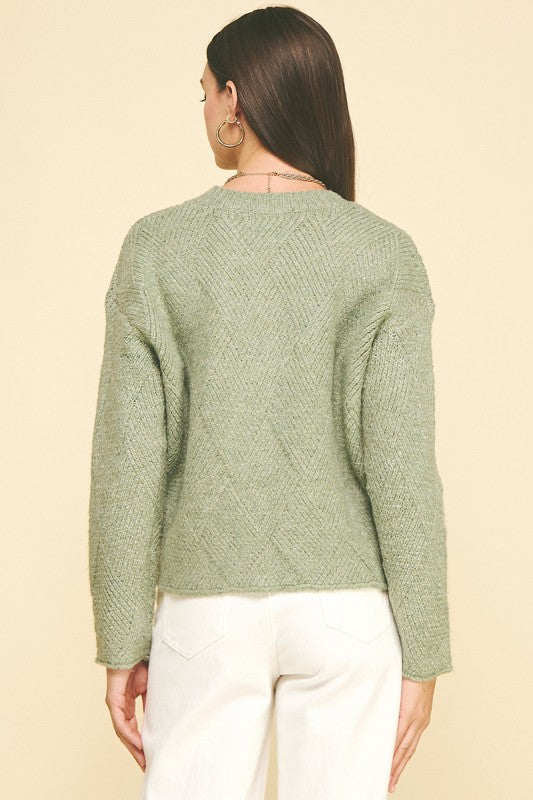 Wrap yourself in cozy charm with this soft sweater in a soothing sage green. Perfect for fall, its soft knit feels like a warm hug, while the playful diamond pattern adds a touch of whimsy. Featuring a comfy round neckline and relaxed drop shoulders, it’s your go-to for laid-back layers and effortless style.