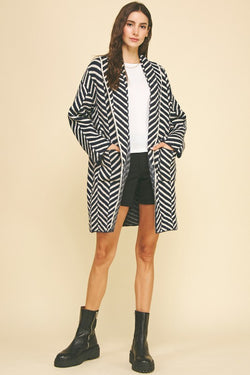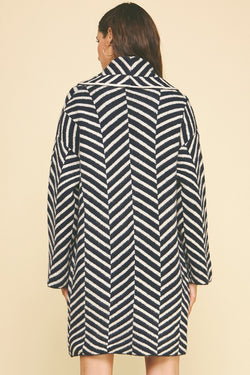 This navy cardigan showcases a chic diagonal stripe pattern, perfectly tailored for fall. Its open-front design and long sleeves create a sleek silhouette, while front pockets add both style and convenience. An elegant layering piece that combines comfort with understated sophistication.