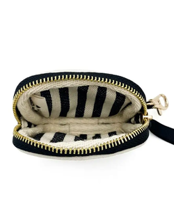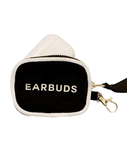 No more digging around the bottom of your bag for your earpods! Our Mini Earbud Zipper Case in black is the perfect solution for all your lost earbuds. Made of durable natural cotton with a zipper closure - this case protects your favorite earpods from drops, bumps, and scratches while keeping them close at hand. The case has a gold clasp making it easy to hang wherever you need. The durable gold metal zipper makes sure your earbuds won't slip out while you're on the go. The case's white piping and white lettering makes for a clean, unisex look.