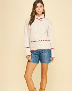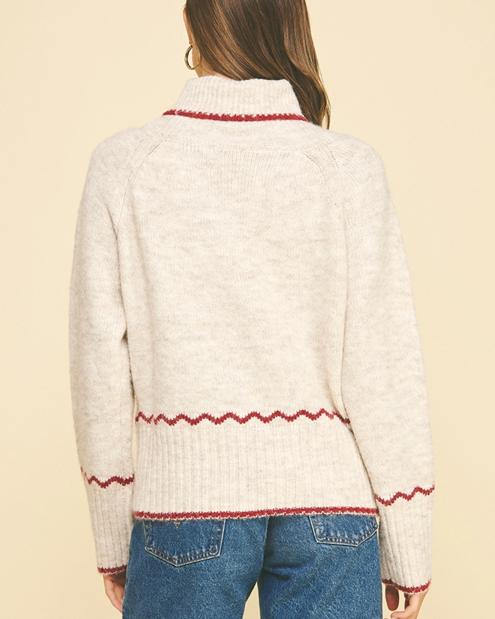 Cozy up in this charming oatmeal knit sweater, where delicate hem details add just the right touch of texture and visual interest.