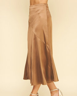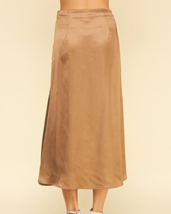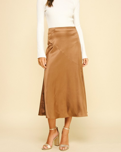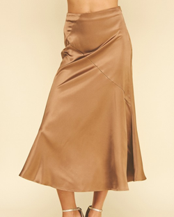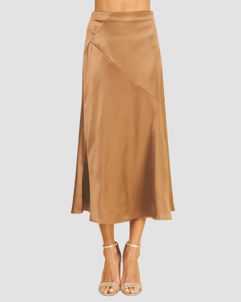 This camel midi skirt features elegant silk block detailing for a refined, timeless look. Its smooth satin finish ensures graceful movement and understated sophistication.
