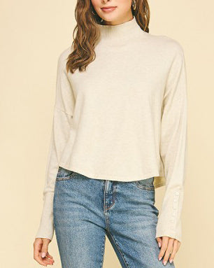 Elevate your fall wardrobe with this sophisticated oatmeal-colored sweater, featuring a graceful mock neck and relaxed drop shoulder design. Elegant button details at the sleeves add a refined touch to this versatile staple, perfect for layering during cooler days. Its timeless style ensures it pairs effortlessly with your favorite fall pieces.