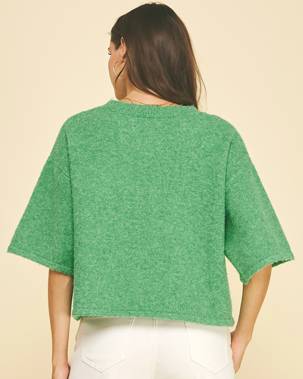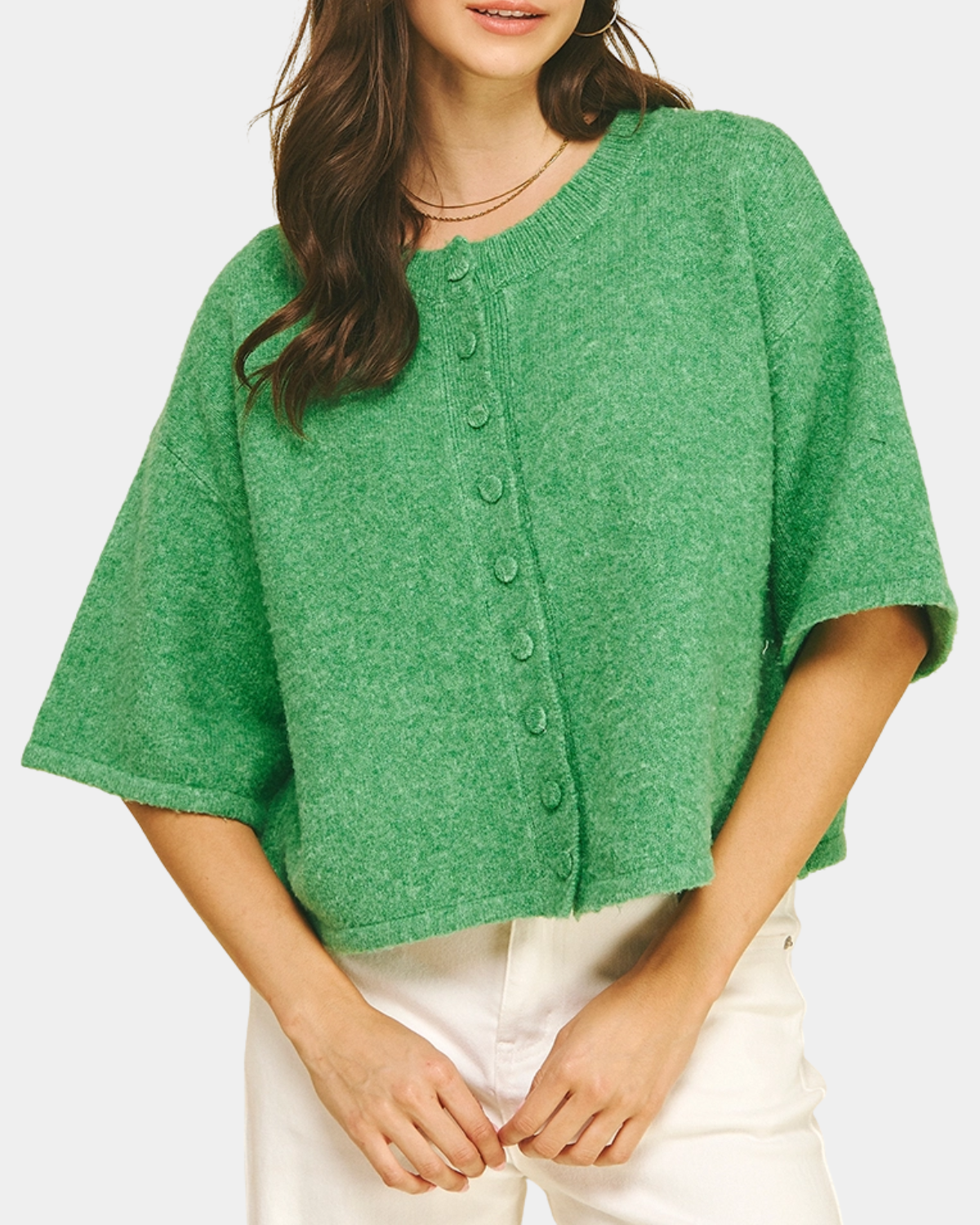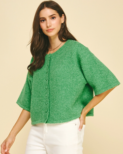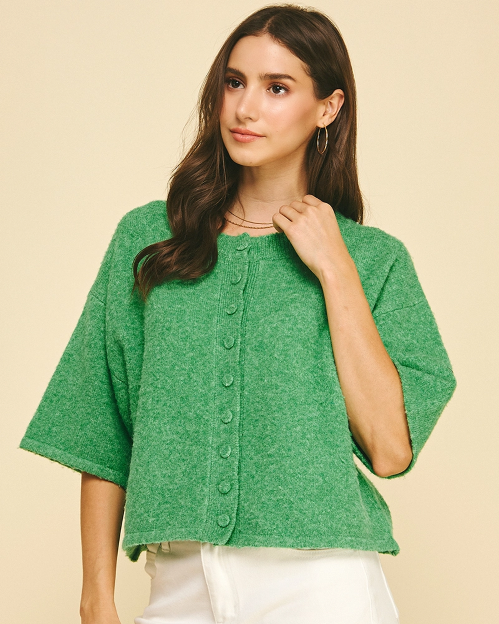 Crisp, preppy, and oh-so-easy to style—this button-down short sleeve sweater in fresh green is your new go-to layer. Perfect for casual days or dressing up with tailored trousers. Comfort meets effortless charm.