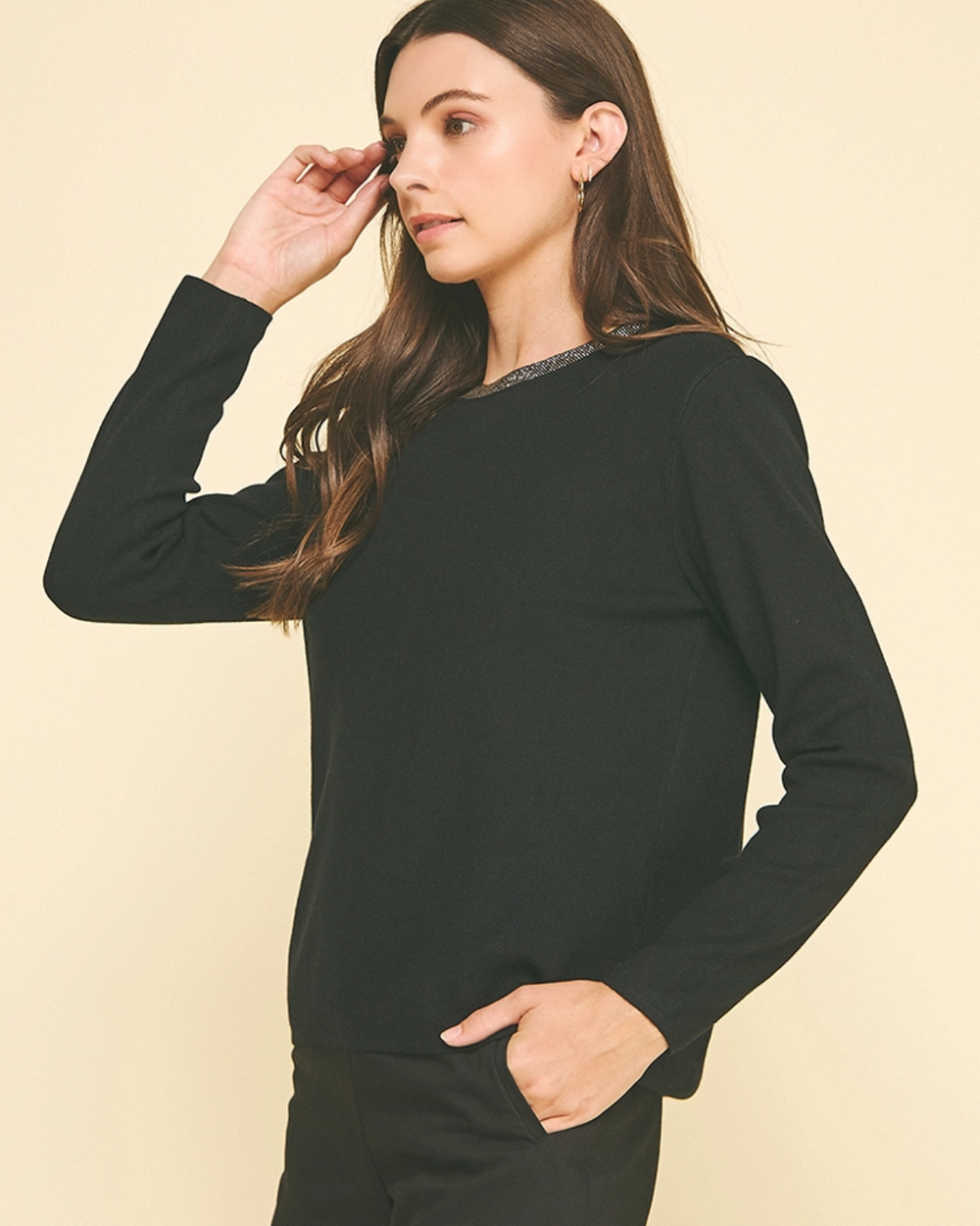 This black sweater features exquisite jewel embellishments that radiate understated luxury. The carefully placed details create a refined aesthetic, perfect for those seeking timeless style.