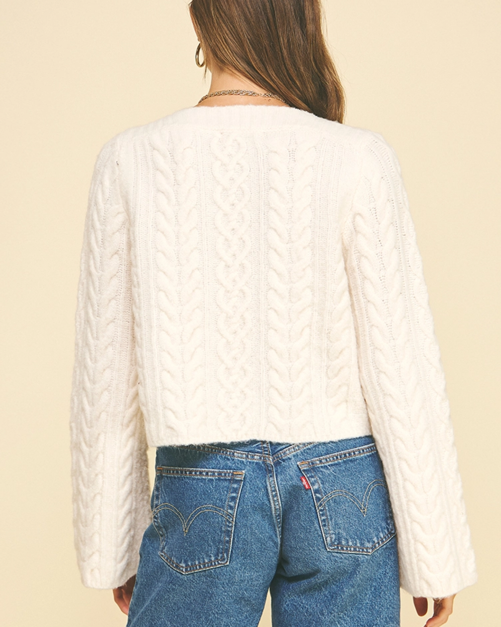 Cozy up in this adorable cream cable knit crop sweater! The classic cable knit texture adds dimension and warmth, while the cropped silhouette keeps things fun and flirty.