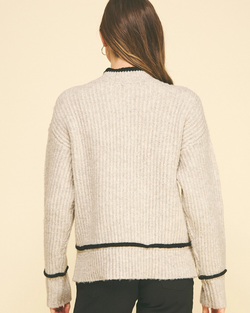 Cozy up in this charming oatmeal knit sweater, where subtle color details add just the right amount of visual interest. Perfect for layering or wearing solo, it's your new go-to for effortless style that feels as good as it looks.