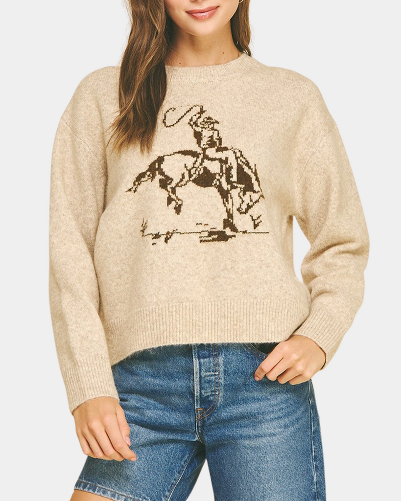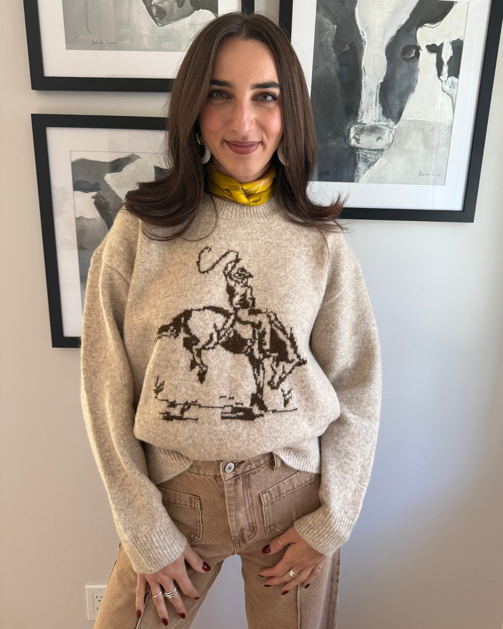 Get cozy with our Western Cowboy Sweater in oatmeal, featuring a playful graphic that brings rustic charm to your everyday look.