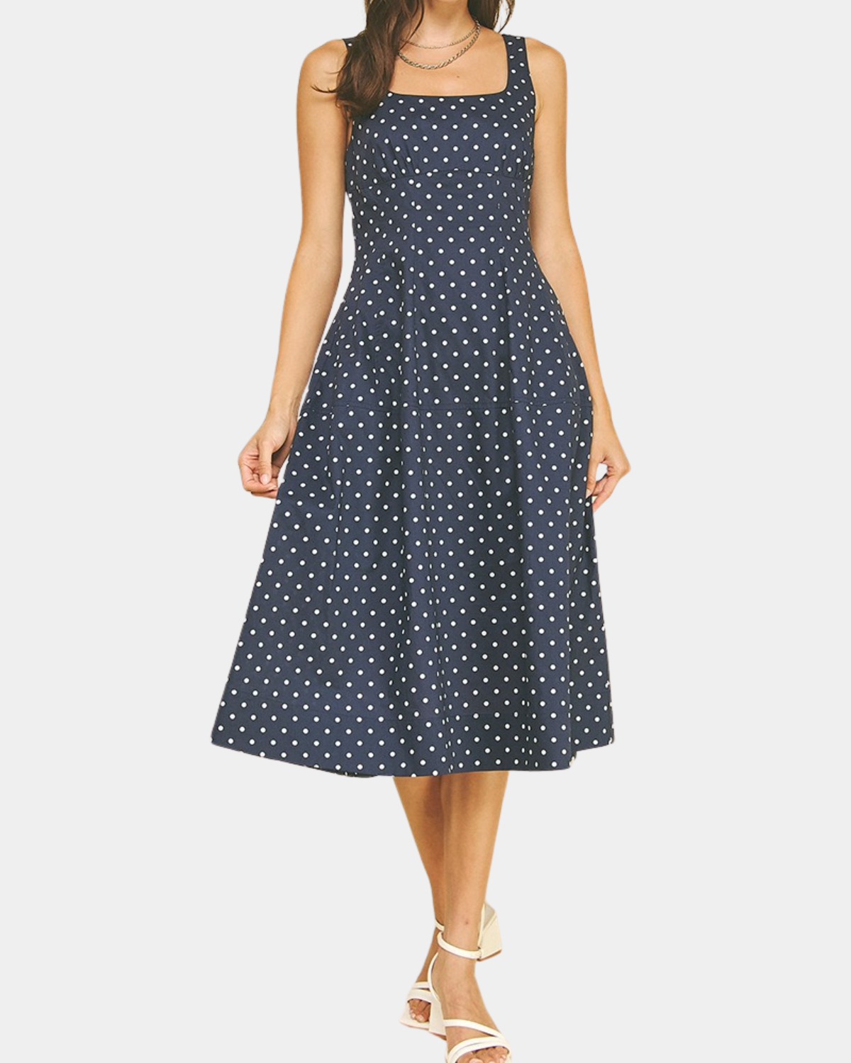 Twirl into the spotlight in this charming navy midi dress! Playful white polka dots dance across a flattering A-line silhouette, while the flared skirt adds movement and fun to every step.