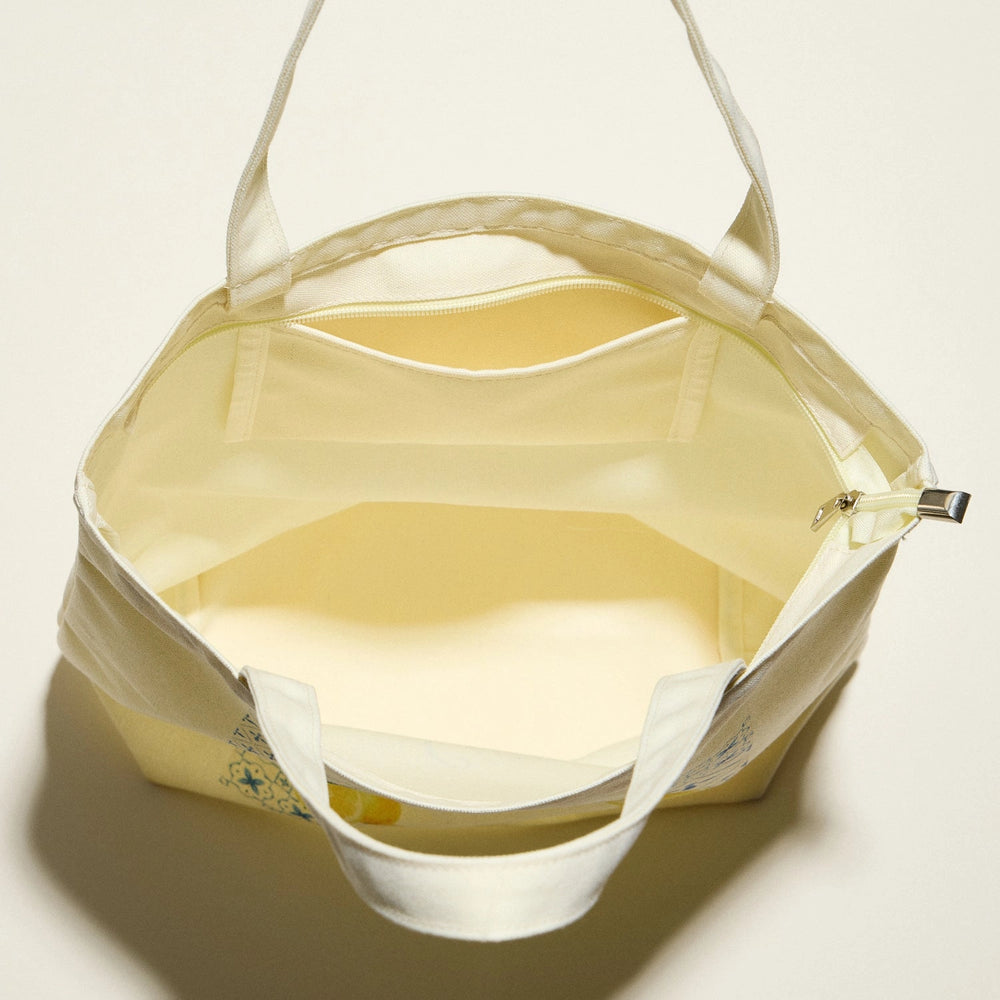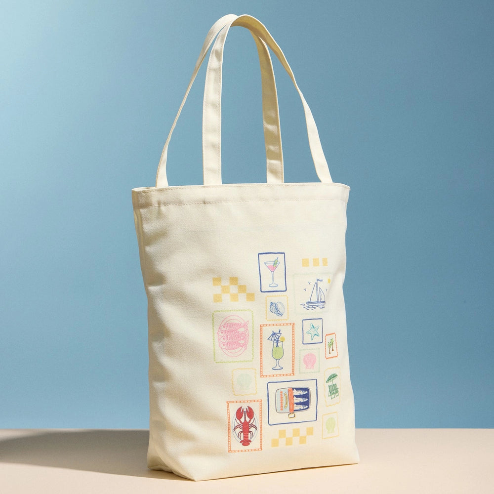 Tote your essentials in style with this cream canvas bag, adorned with whimsical coastal stamps that capture beachy vibes. Crafted from sturdy cotton canvas with roomy capacity and comfortable shoulder straps, it's your go-to companion for shopping, beach trips, and everyday adventures.