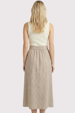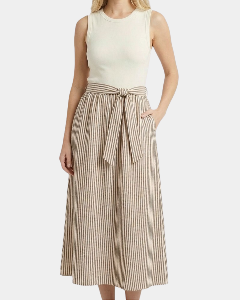 Effortlessly chic, this knit combo stripe dress in warm toffee tones features a flattering self-tie waist belt and practical side pockets. Perfect for transitioning from office to evening.