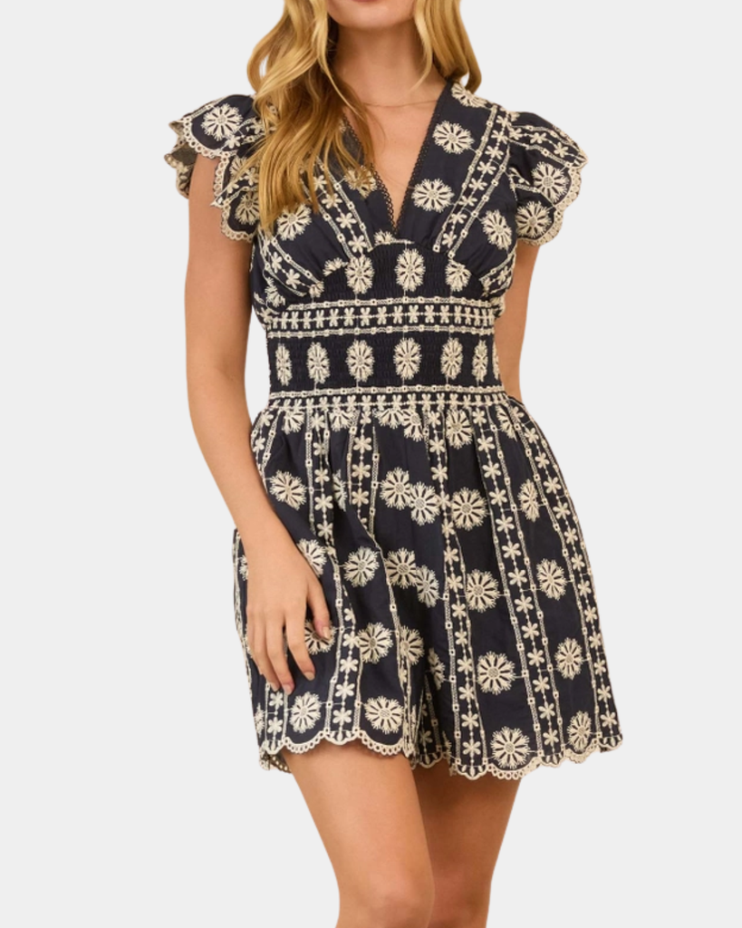Covered in charming embroidered details this navy and white romper is perfect for those warm-weather days when you want to look polished without the fuss. The relaxed fit works for everything from casual outings to resort-ready moments. Slip it on and go!