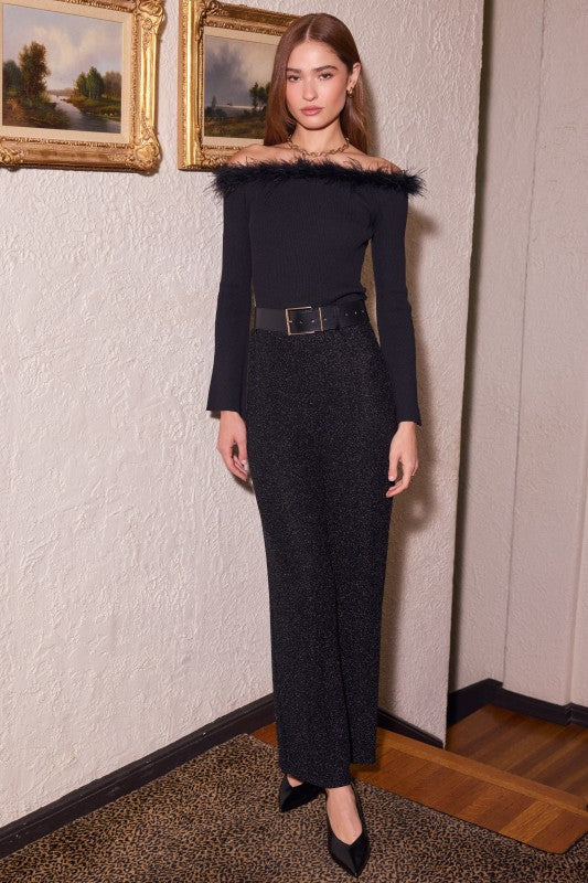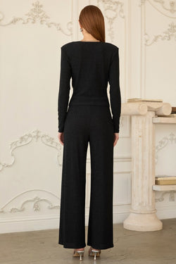 Elevate your wardrobe with these Shimmer Wide Leg Pants in black. Designed with a high waist and tailored waistline, they create a sleek, elongating silhouette. The wide-leg cut flows elegantly from the hips, ensuring both comfort and refined style. Perfect as a standout piece, these trousers bring effortless sophistication to any evening ensemble.