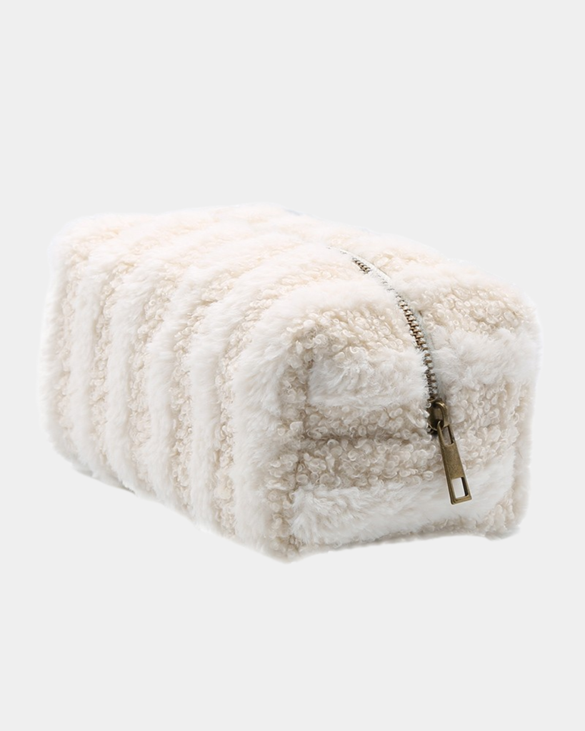 Keep your essentials cozy and organized with this Stripe Sherpa Zipper Pouch. Its soft sherpa texture and fun stripe pattern make travel feel like a comfy adventure!