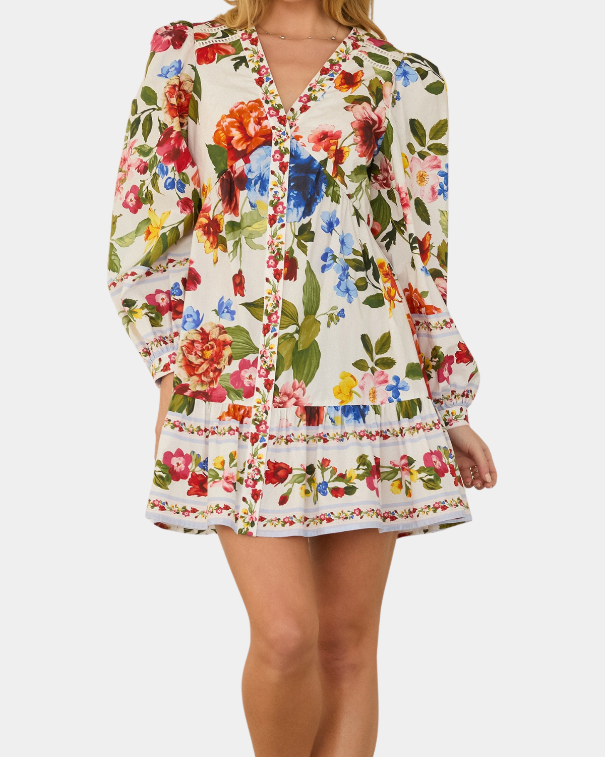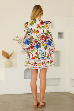 Twirl into spring with this playful long-sleeve floral mini dress. The vintage-inspired border print adds whimsical charm, while the lightweight woven fabric keeps you cool and comfortable. Pair with sandals for laid-back vibes or slip on heels to elevate your look.