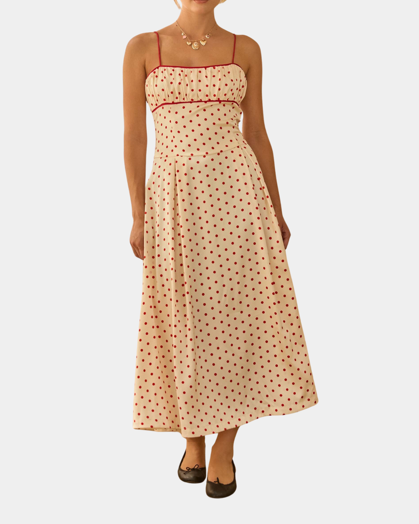 This sleeveless midi dress combines vintage polka dot charm with modern flair. Crisp contrast piping and a flattering silhouette make it ideal for any occasion—casual lunch or night out. Style with sandals or heels for instant versatility.