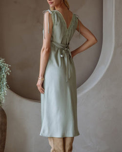 This gorgeous lace trim slip dress features a sleeveless silhouette, tie details at the shoulder and a self tie at the waist. Tie it in front or back for an elegant and classic look.