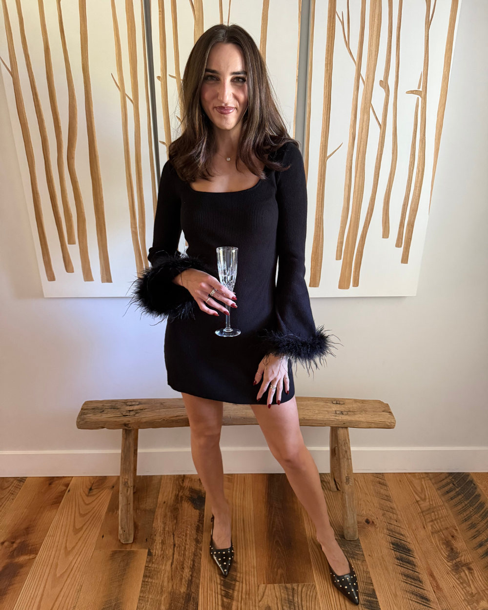 Turn heads in this playful black mini dress featuring whimsical feather cuffs that add a flirty touch to your look. Perfect for nights out when you want to feel effortlessly chic and fun.
