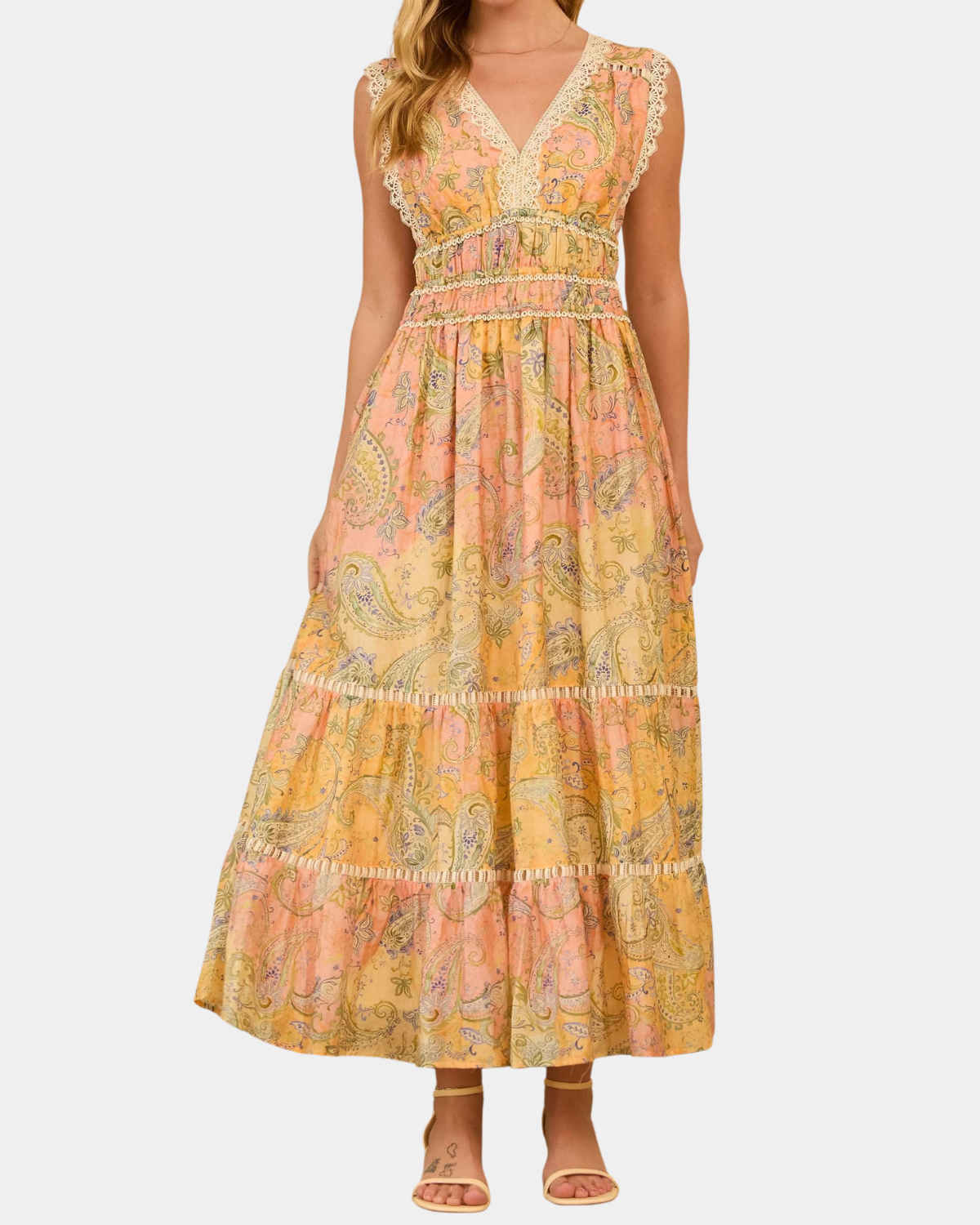 This printed maxi dress is your go-to for effortless style. The flowing silhouette flatters beautifully, while delicate lace trim adds romantic flair. Rock it with sandals for day or heels for night—it's the versatile piece every wardrobe needs.