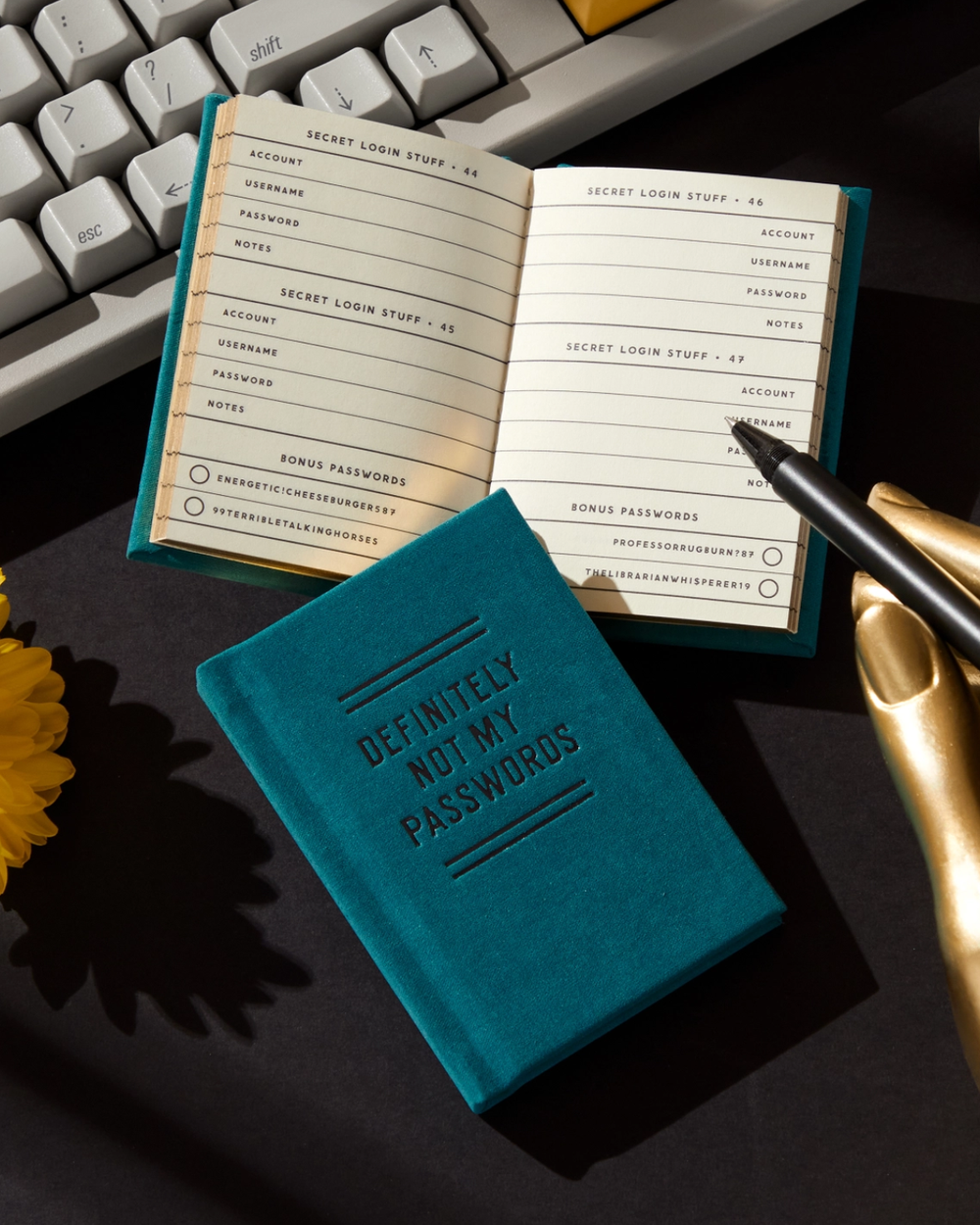 A cheeky little notebook for documenting all those passwords you definitely shouldn't write down—but probably will anyway. Vintage-inspired design meets modern digital life in this compact keeper. Perfect for anyone tired of password reset emails.