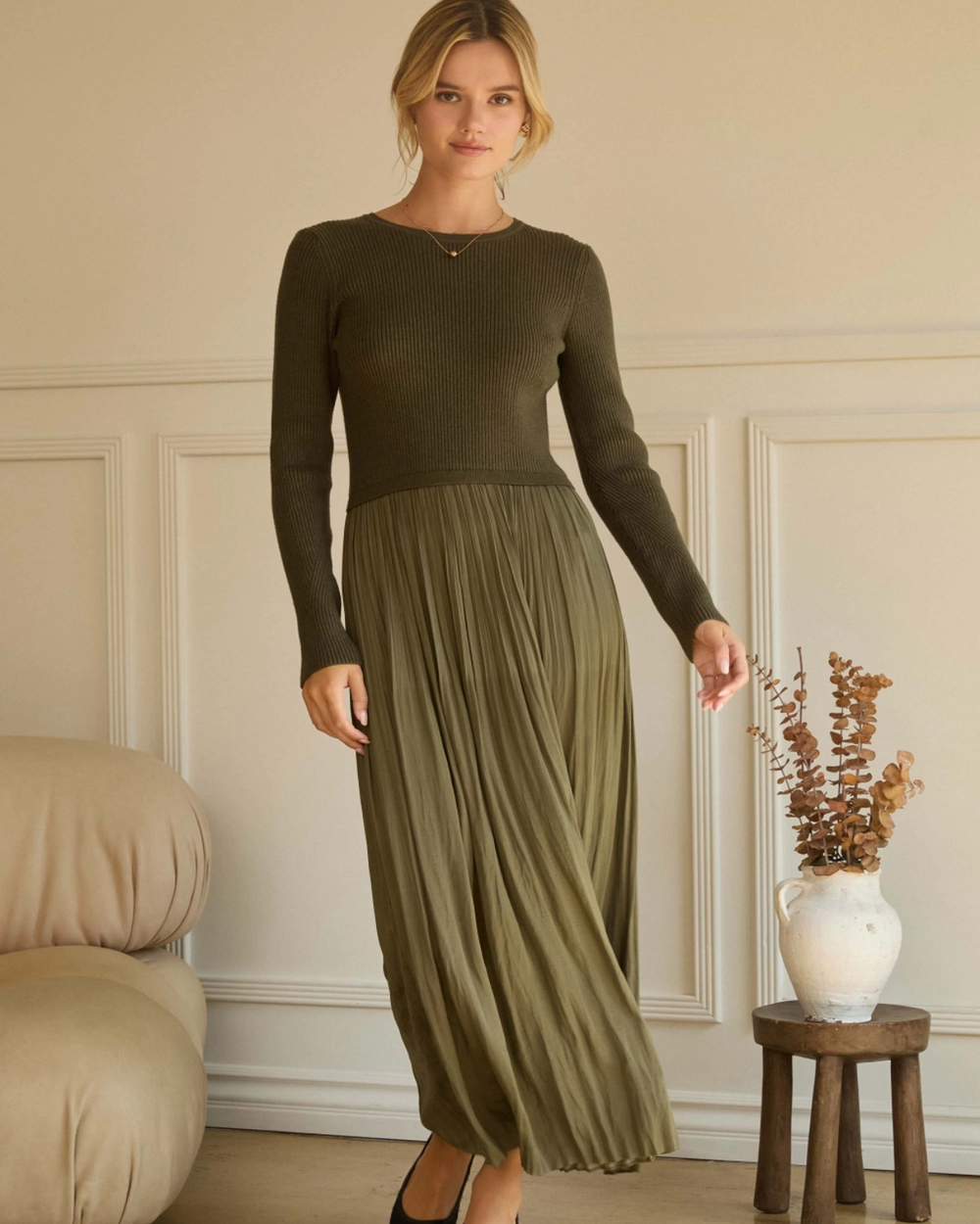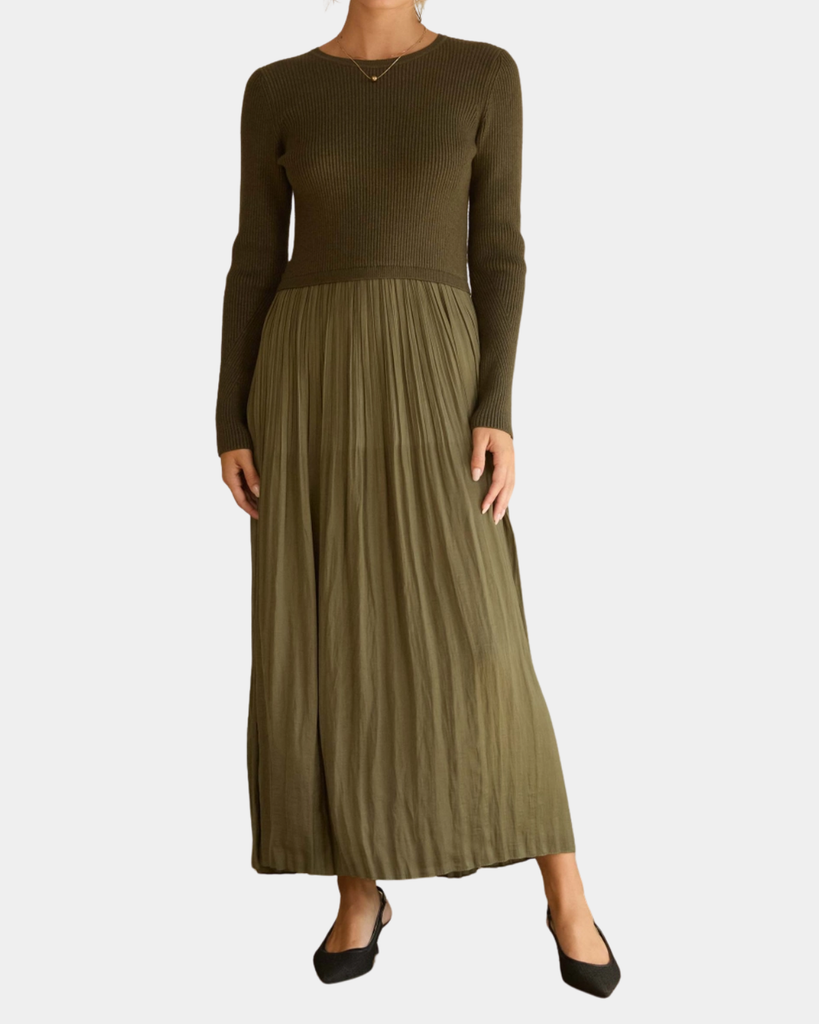 A masterclass in understated elegance, this dark olive dress pairs a fitted ribbed knit bodice with a gracefully pleated woven skirt. Versatile enough for day or evening, it transitions seamlessly from professional settings to refined occasions.