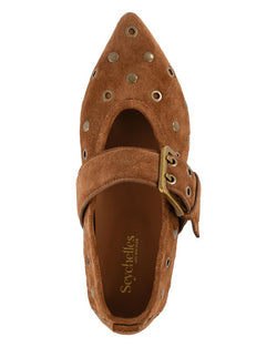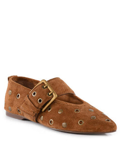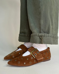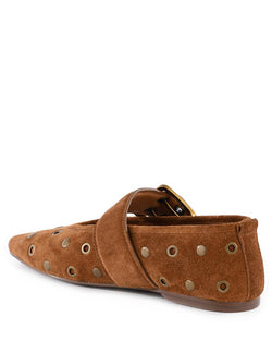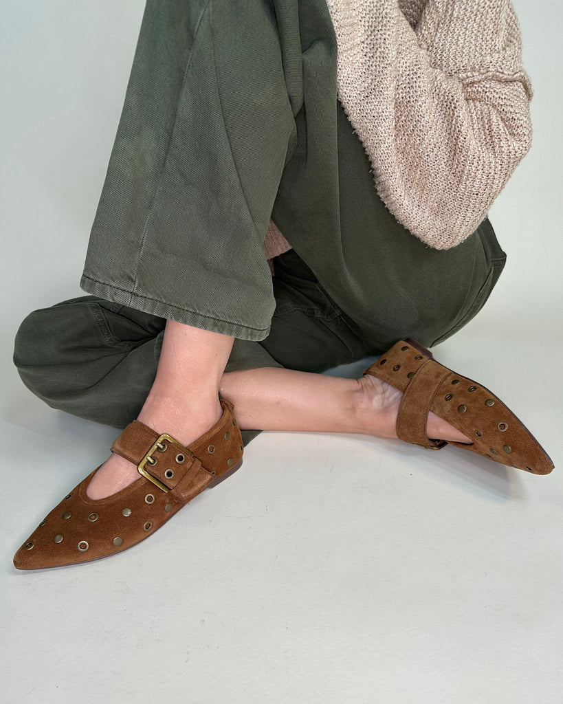 These brown suede flats feature gold hardware and a buckle across the front. A modern update to a classic silhouette, these flats are soft, comfy and so chic.