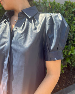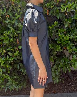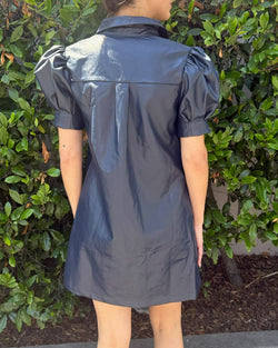 This rich vegan leather mini dress features a button down front, short puff sleeves and a collared neckline. Done in a navy blue shade, this dress can be styled for a night out with heels or boots or for day with sneakers.