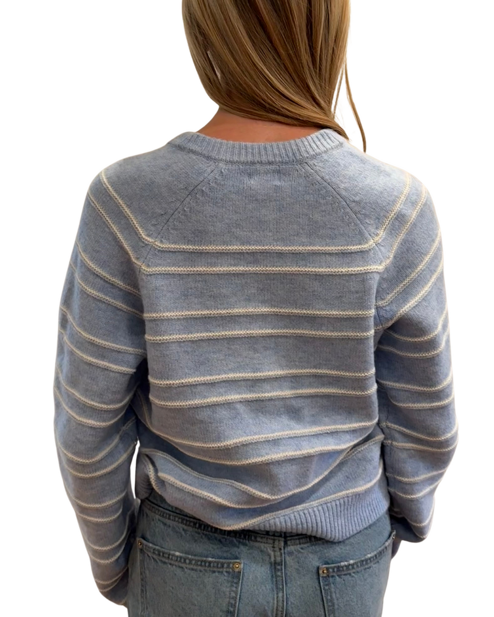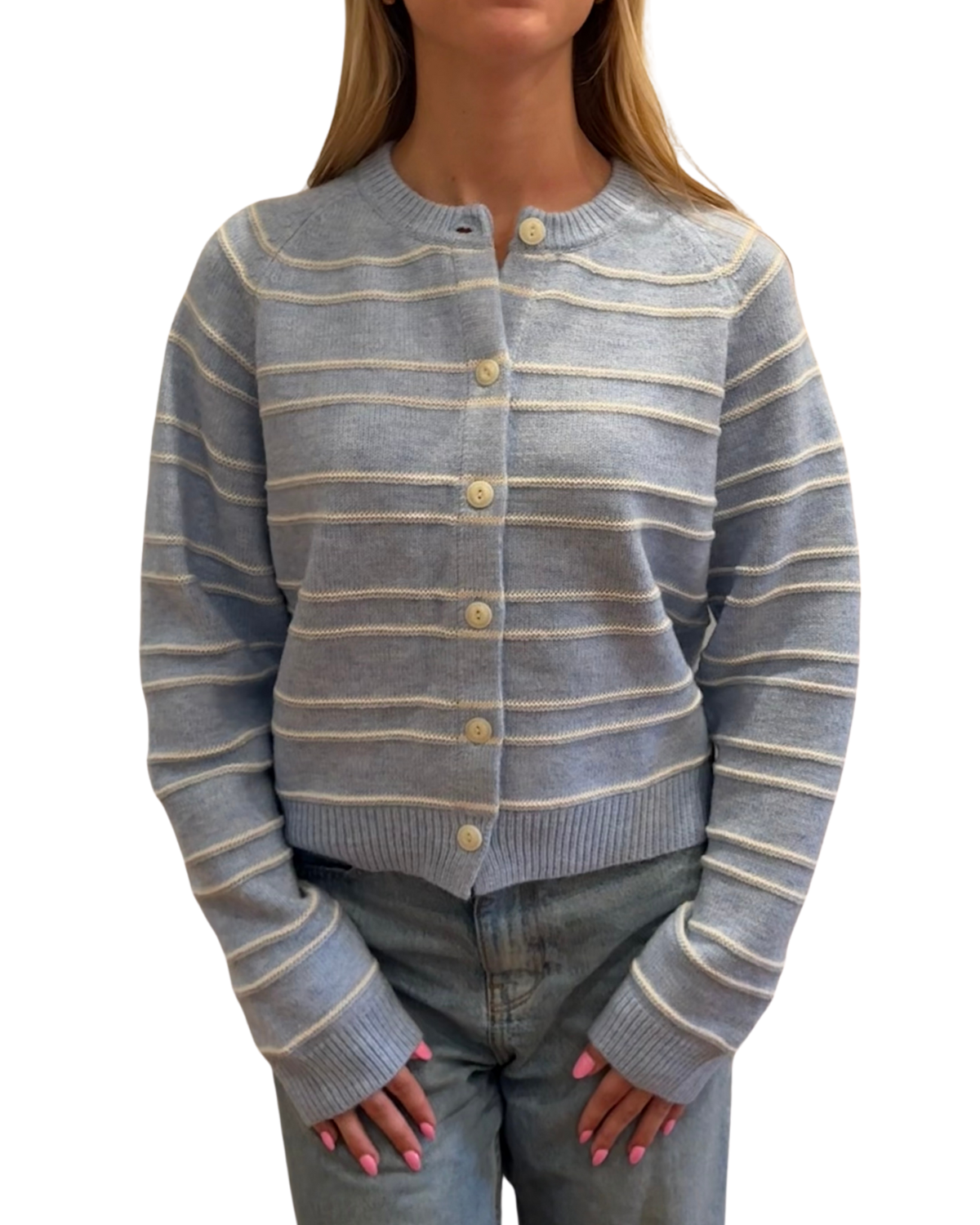 Add a splash of whimsy to your wardrobe with this striped light blue cardigan that’s as cozy as it is cute. Perfect for layering on sunny or chilly days, it brings a playful pop of color to every outfit.