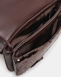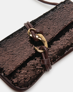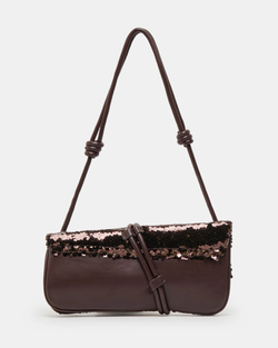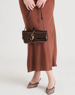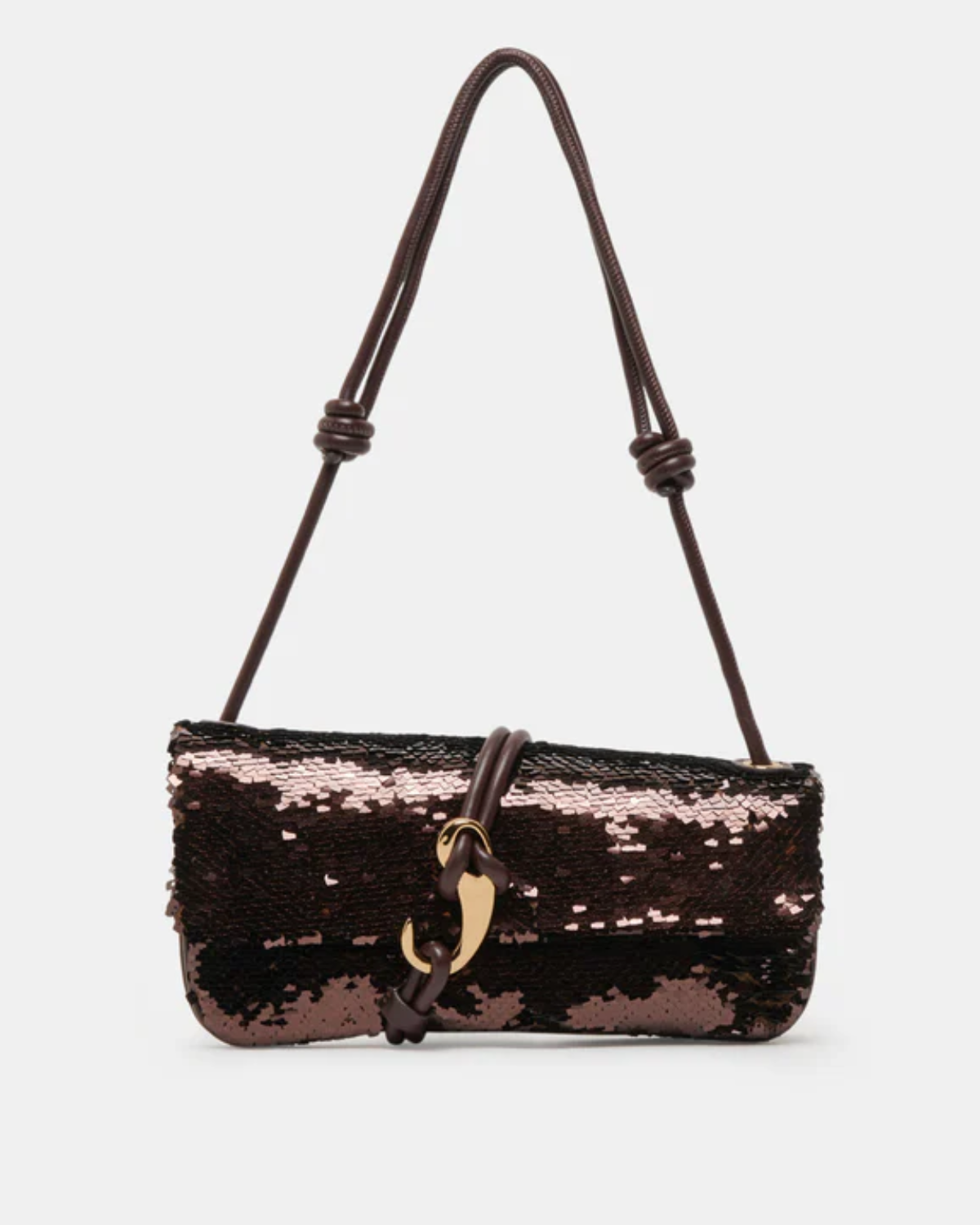 This refined baguette bag delivers understated sophistication with its signature metal hook clasp and knotted strap detail. The adjustable shoulder silhouette in brown sequin offers versatile styling for the discerning collector who appreciates quality craftsmanship and distinctive design elements.