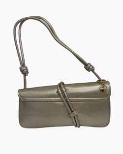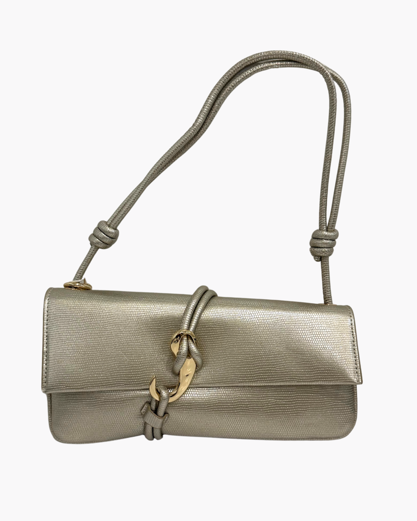 This refined baguette bag delivers understated sophistication with its signature metal hook clasp and knotted strap detail. The adjustable shoulder silhouette offers versatile styling for the discerning collector who appreciates quality craftsmanship and distinctive design elements.