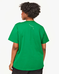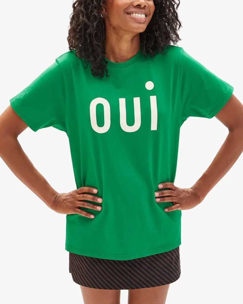 The Clare V. Original Tee in Green Apple with Cream Oui adds a playful touch to your wardrobe. Featuring a unique color and a fun French phrase, this tee is sure to catch some attention. Comfortable and stylish, it's perfect for any casual occasion. Oui, please!