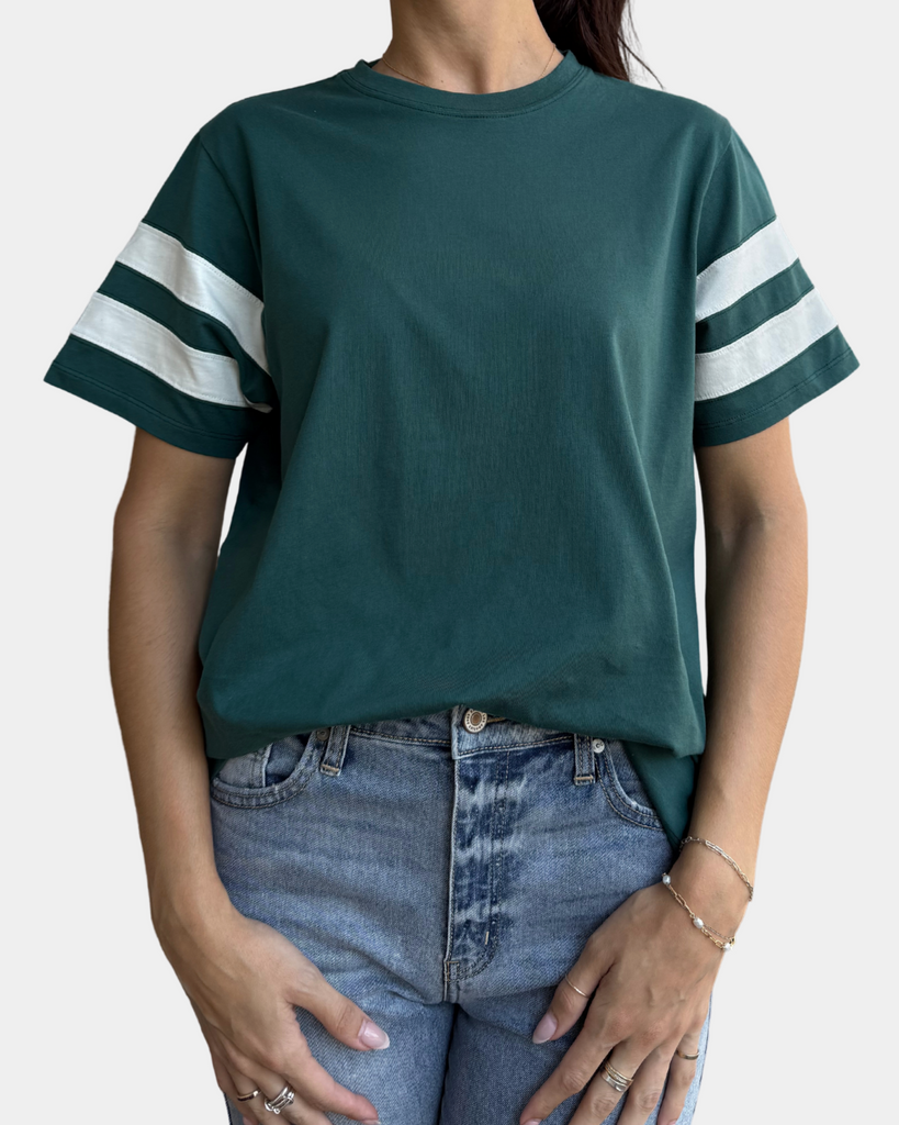 Get game-day ready with the Clare V. Original Varsity Tee in Deep Pine/Cream—your go-to for effortless style and a dash of MVP confidence. This tee turns casual vibes into winning looks wherever you wear it.