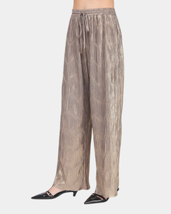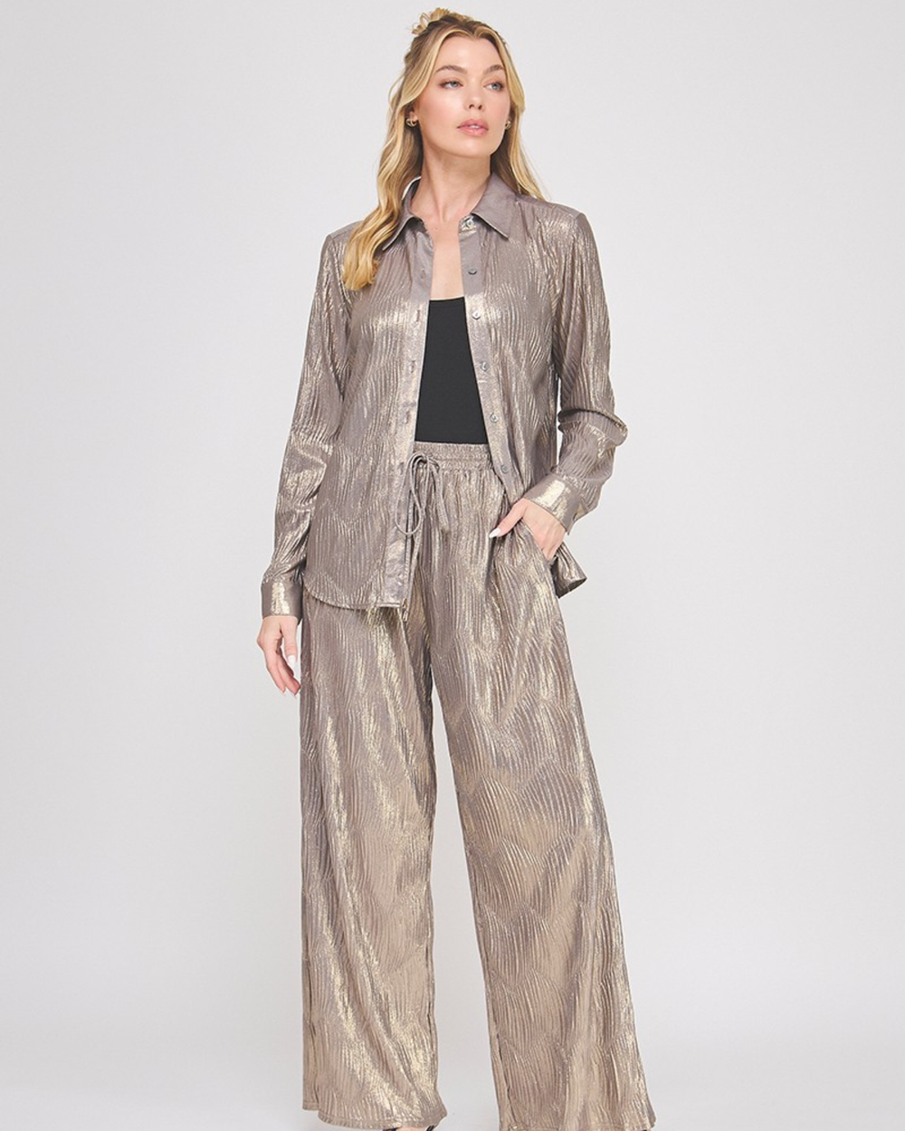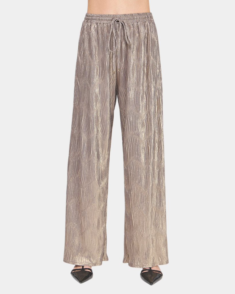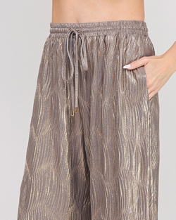 Shimmer with these shell-patterned wide leg pants in sparkling Champagne Gold. Mix and match or pair with the shimmer long sleeve top for a show-stopping set!