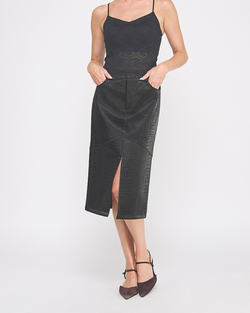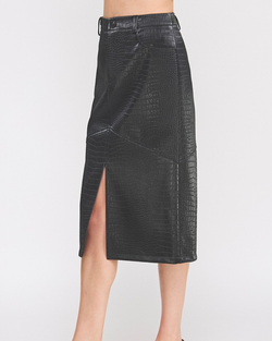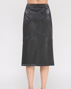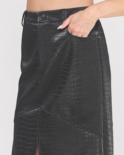 This black faux snake leather midi skirt exudes timeless elegance with its sleek texture and a tasteful front slit.