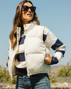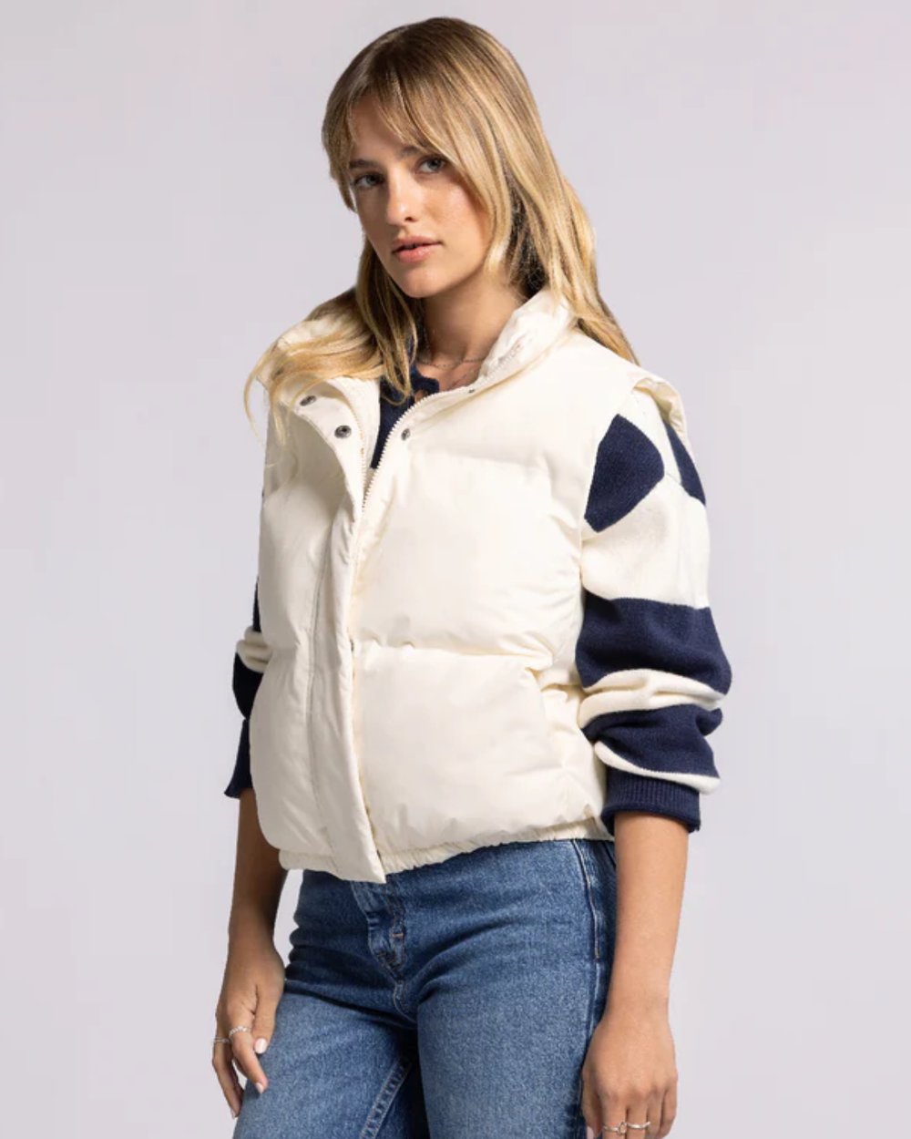 This cropped puffer vest is your go-to for effortless warmth and style. Zip it up, snap it closed, and slip your hands into the side pockets—comfort sorted.
