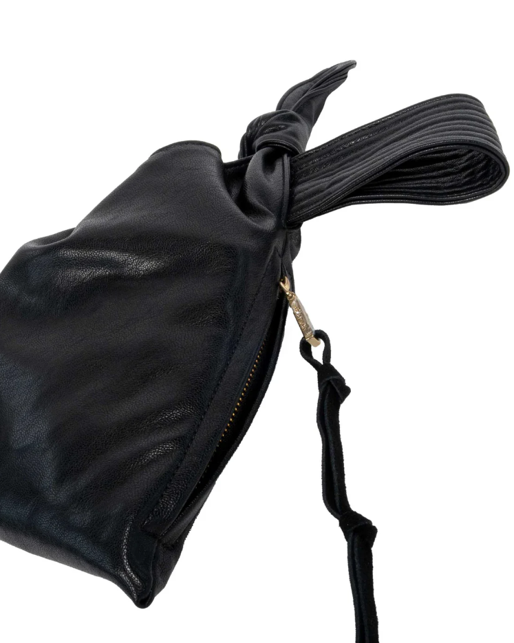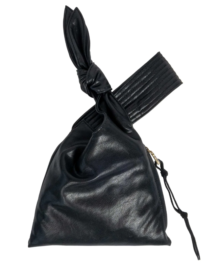 Elevate your look with the Dolce Vita Aspen Wristlet Bag in sleek black leather. This on-trend accessory features a unique knot detail and a convenient side zipper, perfectly blending style and function. Whether you're out for brunch or hitting the town at night, its compact design keeps essentials close with a playful twist.
