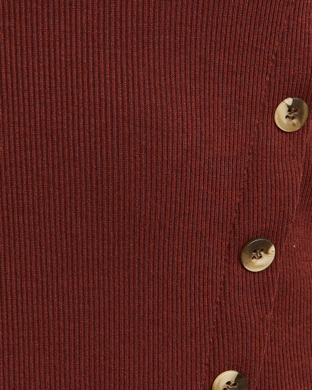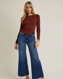Effortless elegance meets modern design in this rust-toned side button-up top. The refined boat neckline frames the shoulders beautifully, while strategically placed side buttons add a contemporary twist.