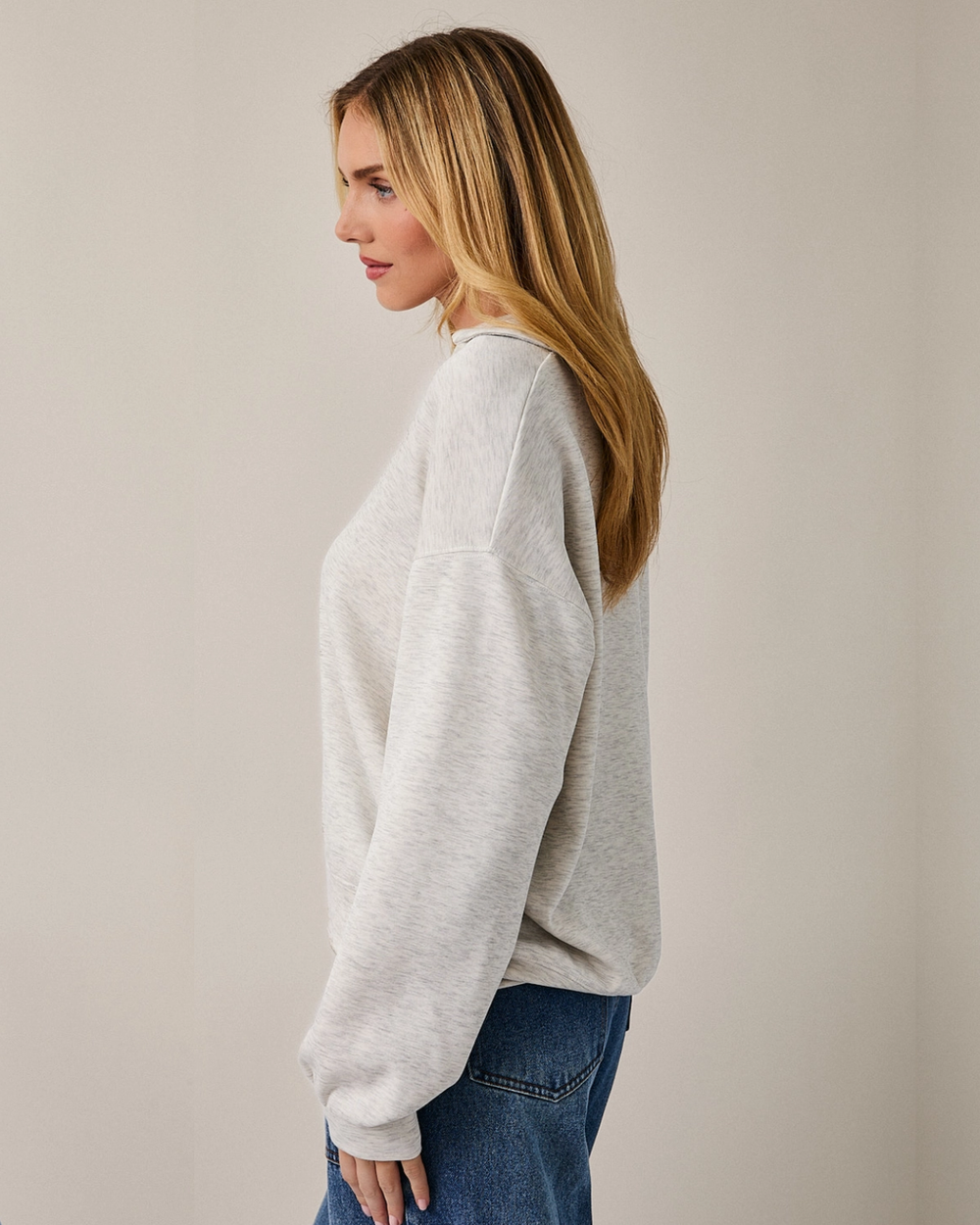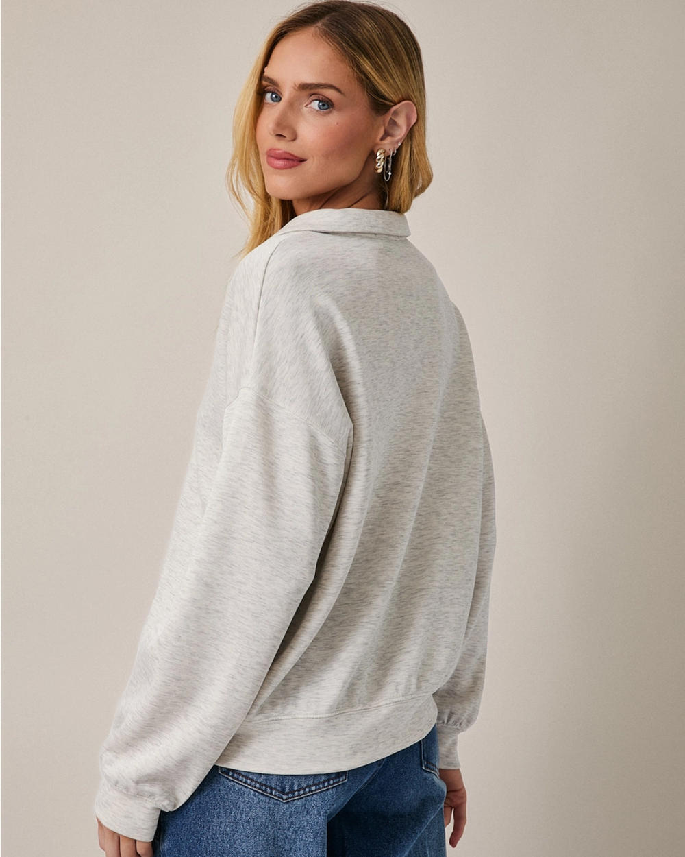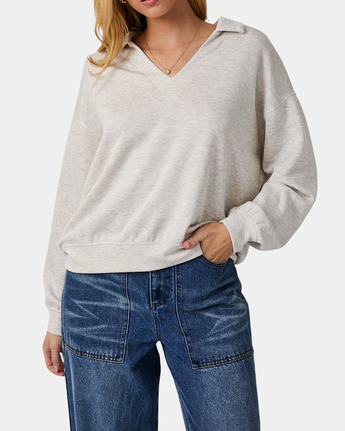 This heather grey V-neck top combines refined simplicity with practical style. The structured collar and long sleeves deliver a polished look that pairs beautifully with tailored pieces or casual basics.