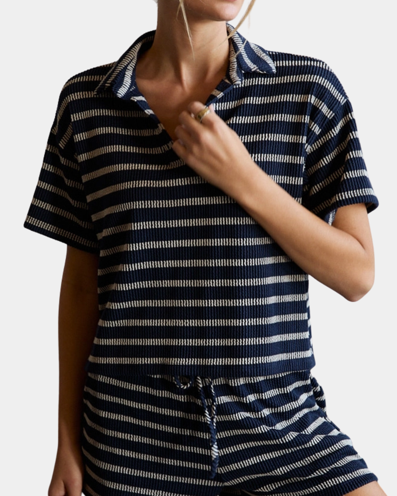 This crisp collared number with playful midnight and oat stripes that work with everything in your closet. Short sleeves, timeless appeal, and just the right amount of personality.