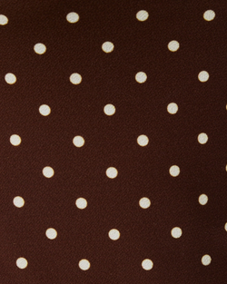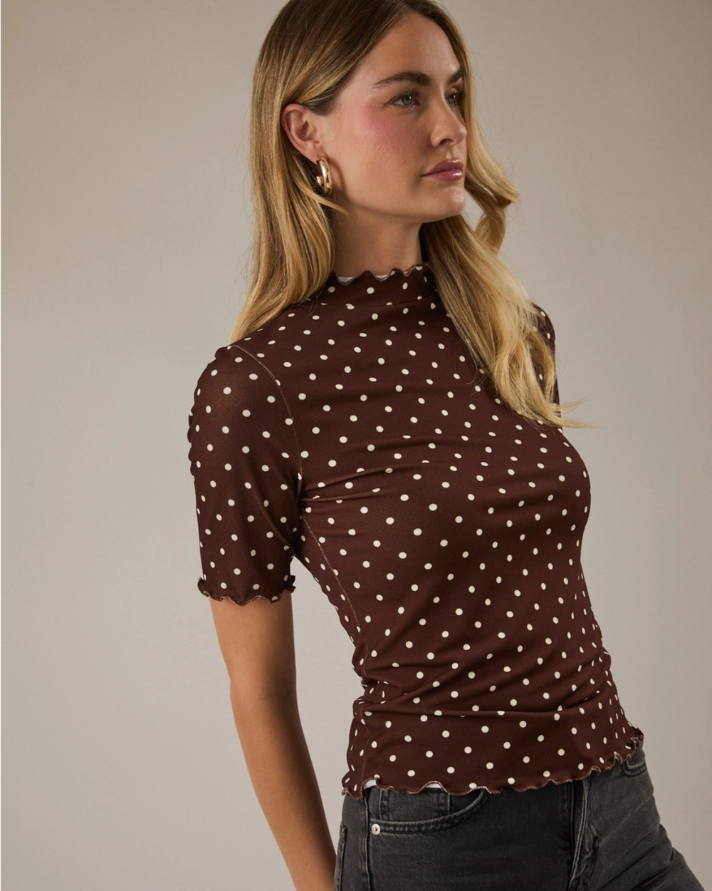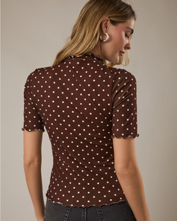 Playful polka dots meet modern style in this charming merrow hem top. The high neckline and elbow sleeves offer a sweet, put-together vibe, while the brown and ivory color combo works with everything in your closet.