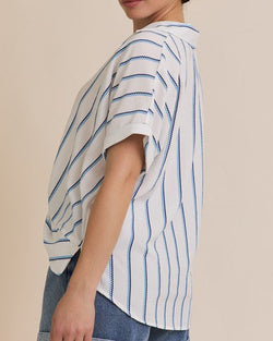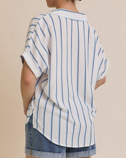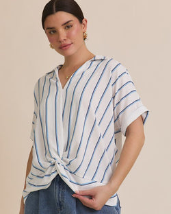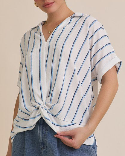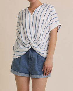 This v-neck top features a chic stripe pattern, short sleeves and a folded twist design at the front hem. Lightweight and comfortable, this top is a summer staple.