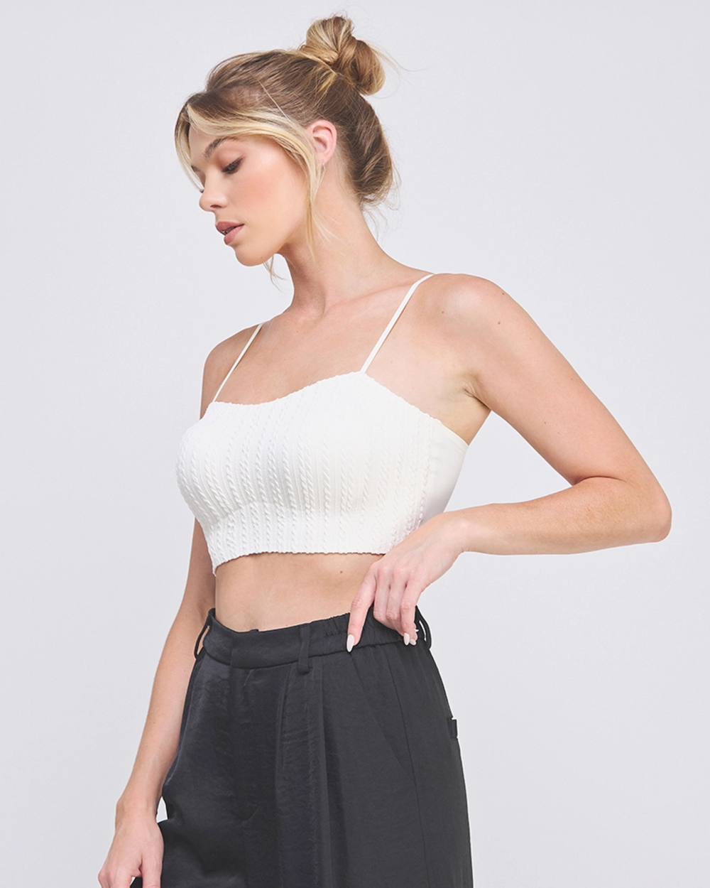 Meet your new go-to bralette! This sleek cable knit style in classic white features a contemporary fit that's as comfy as it is cute. Layer it, flaunt it—either way, you're winning.